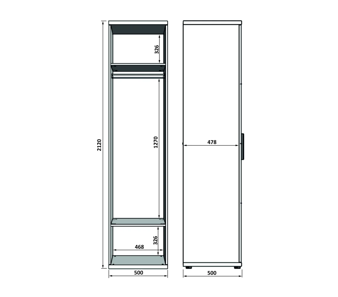 Шкаф 1-створчатый СД-02 Сидней, со штангой и 2 полками, фасад ЛДСП с отделкой ал. профилем.