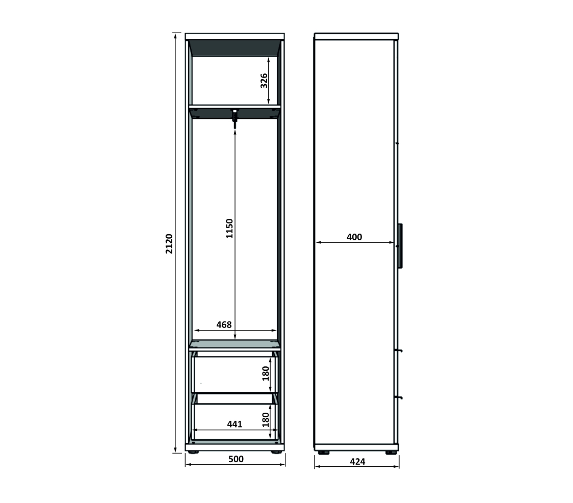 - Нагрузка: на полку — 5 кг, на штангу — 15 кг, на дно ящика - 10кг.