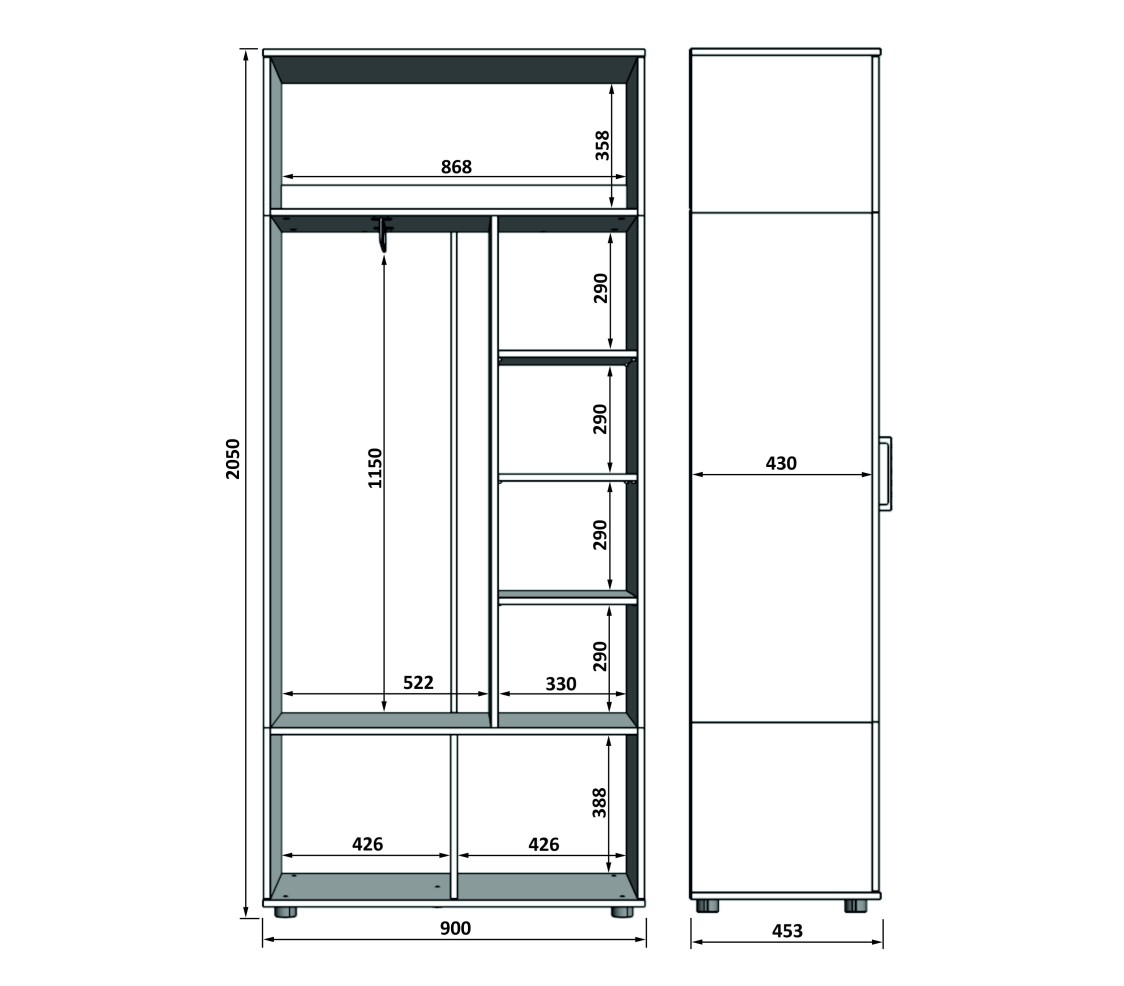 Стандартные габариты: Ш/Г/В: 900/450/2050 мм.