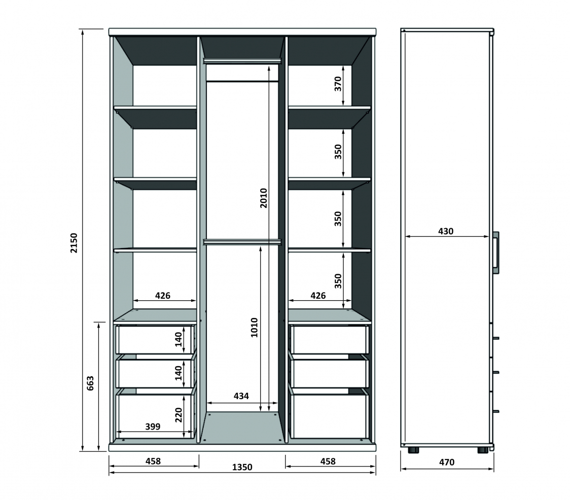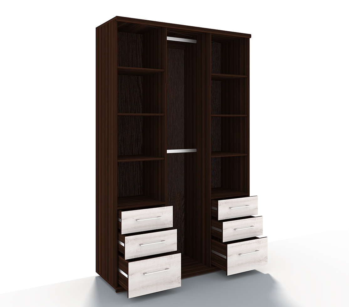 Шкаф 3-створчатый БН-135 Бали с 2 штангами, с 8 полками и 6 выдвижными ящиками.