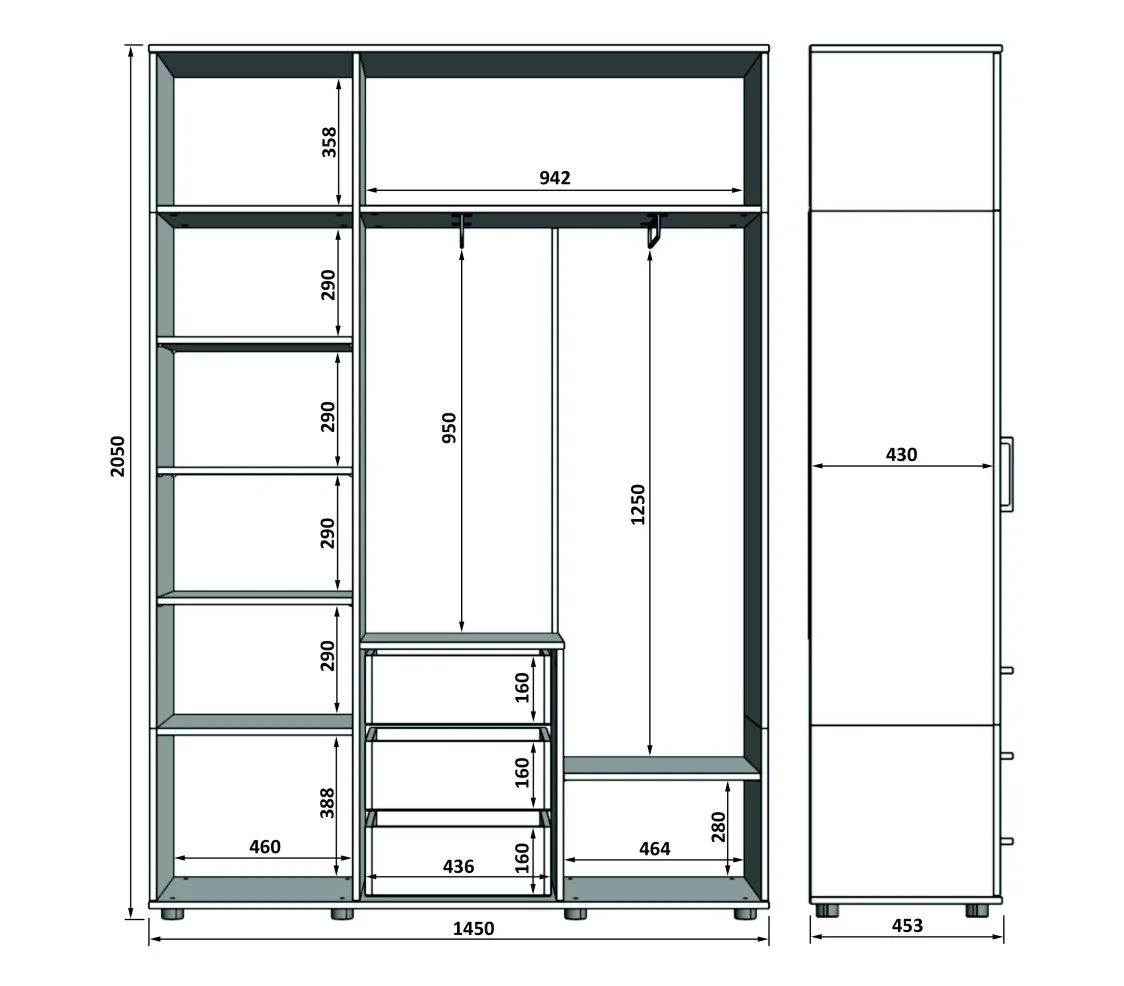 Стандартные габариты: Ш/Г/В: 1450/450/2050 мм.