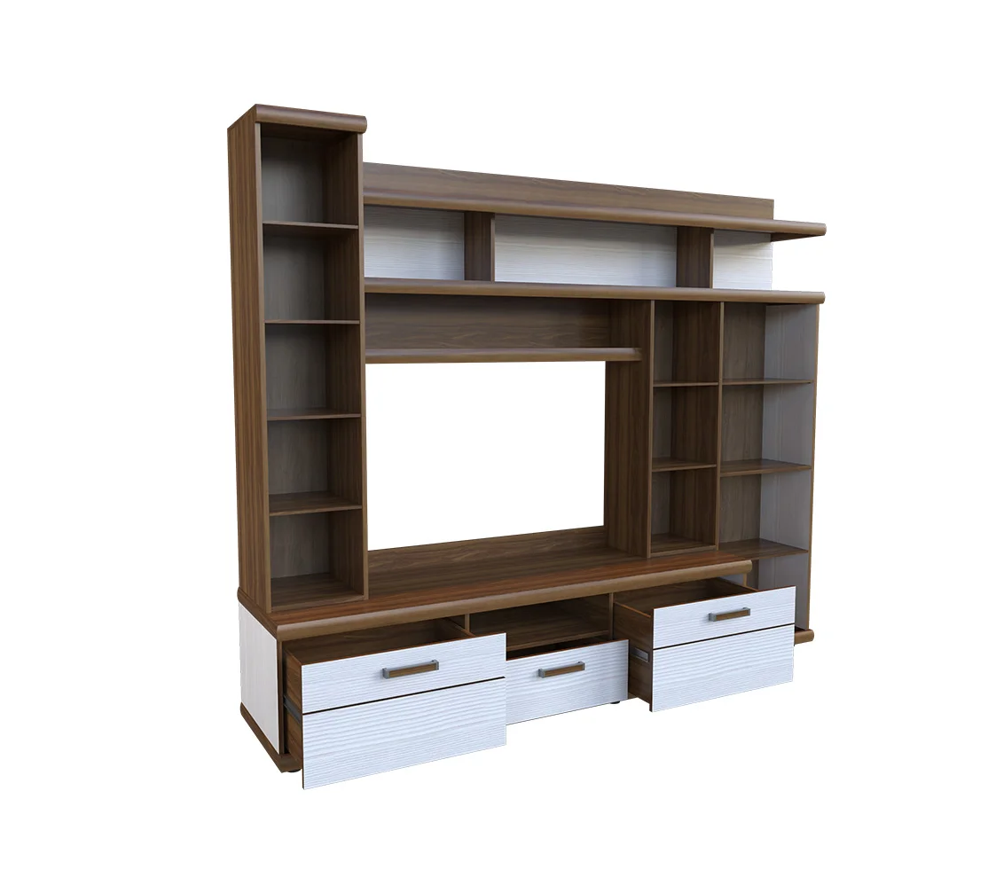 Линейная модульная стенка «Дрезден-1» отличается стильным исполнением. Сочетание контрастных оттенков в оформлении корпуса и фасадов, а также стеклянные вставки делают мебельную конструкцию визуально компактной. При этом все шкафы и витрины достаточно вместительные. Предусмотрены навесные полки и тумба под установку телевизора.