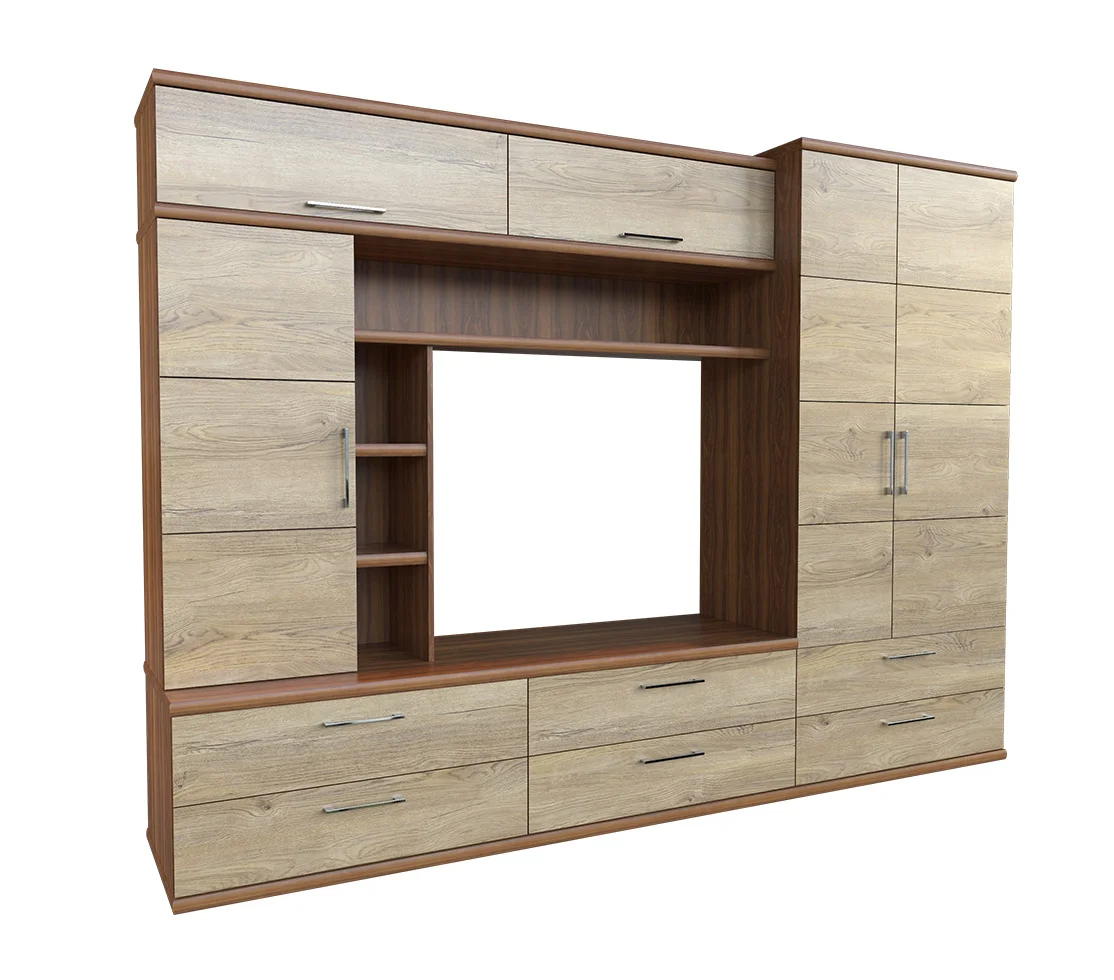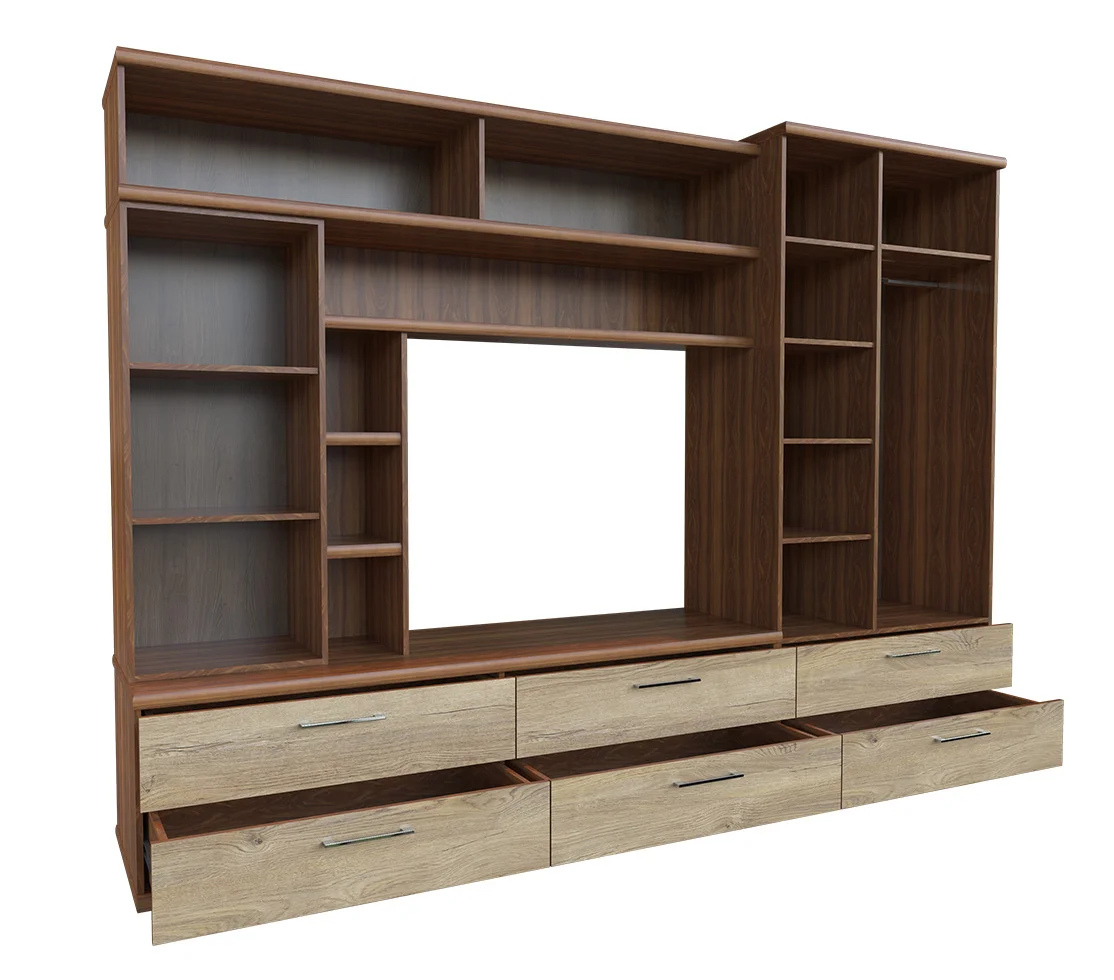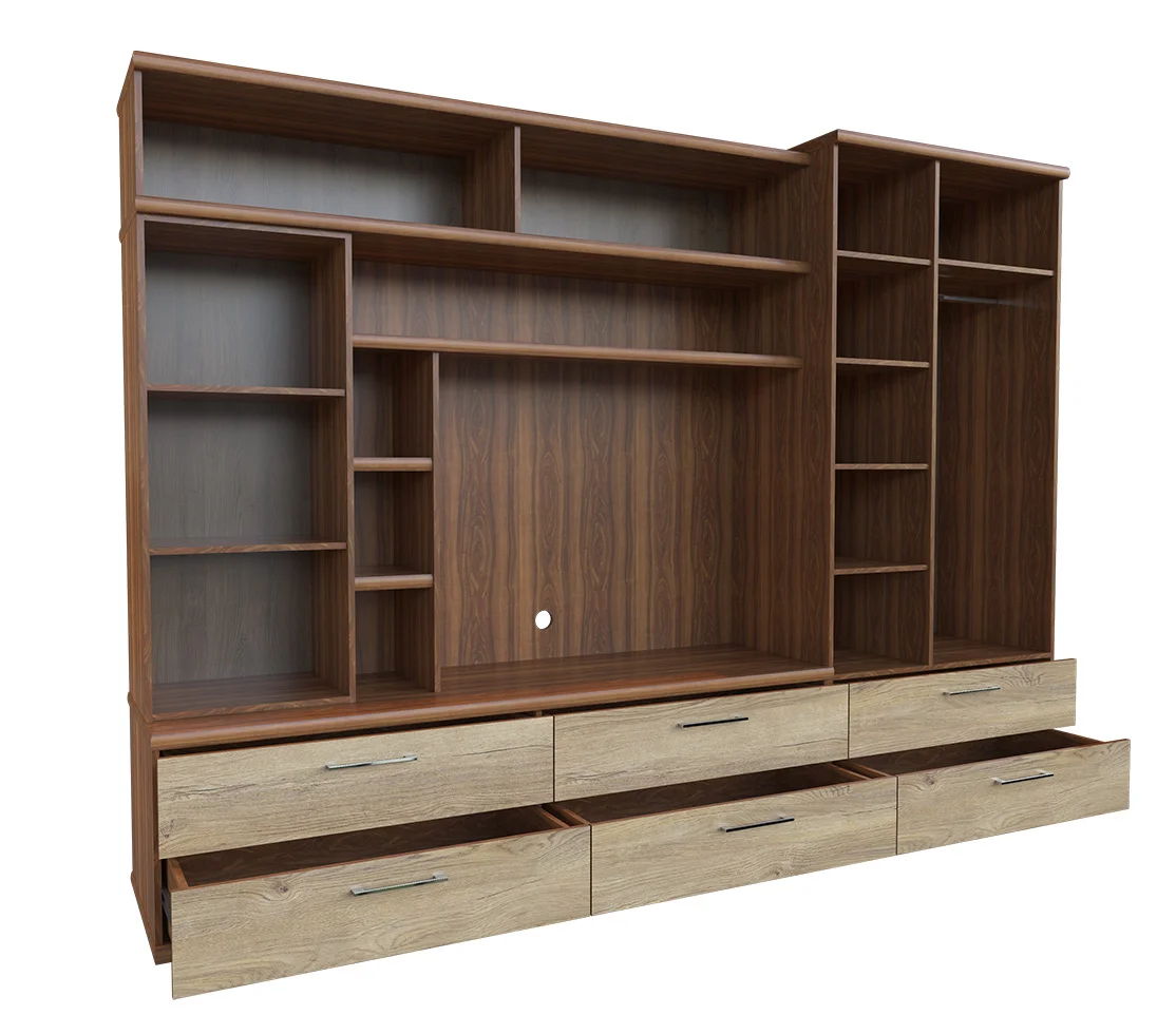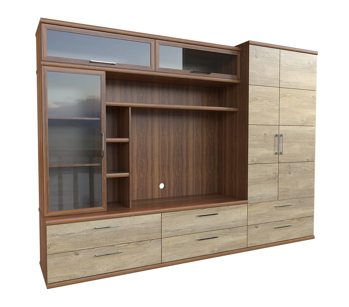 Общие габариты стенки Ш/В/Г: 2860/2108/560 мм. Ширина шкафа 960 мм, тумбы большой - 1900 мм.