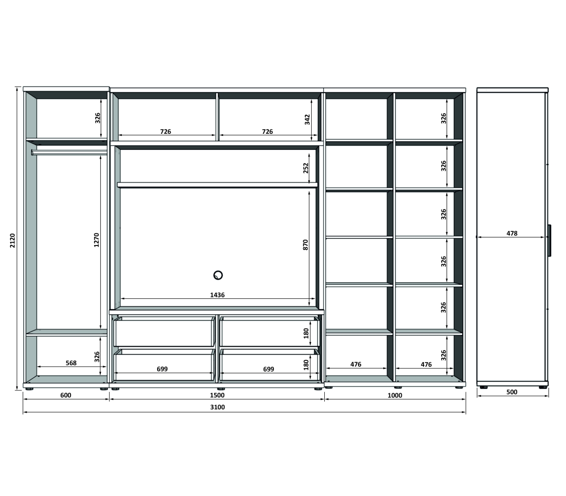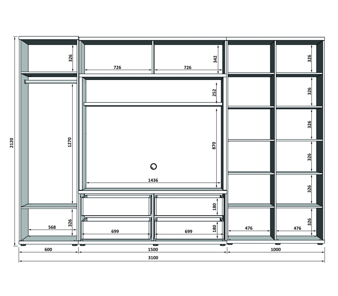 - Полки: ЛДСП 16 мм, стекло 4 или 8 мм.