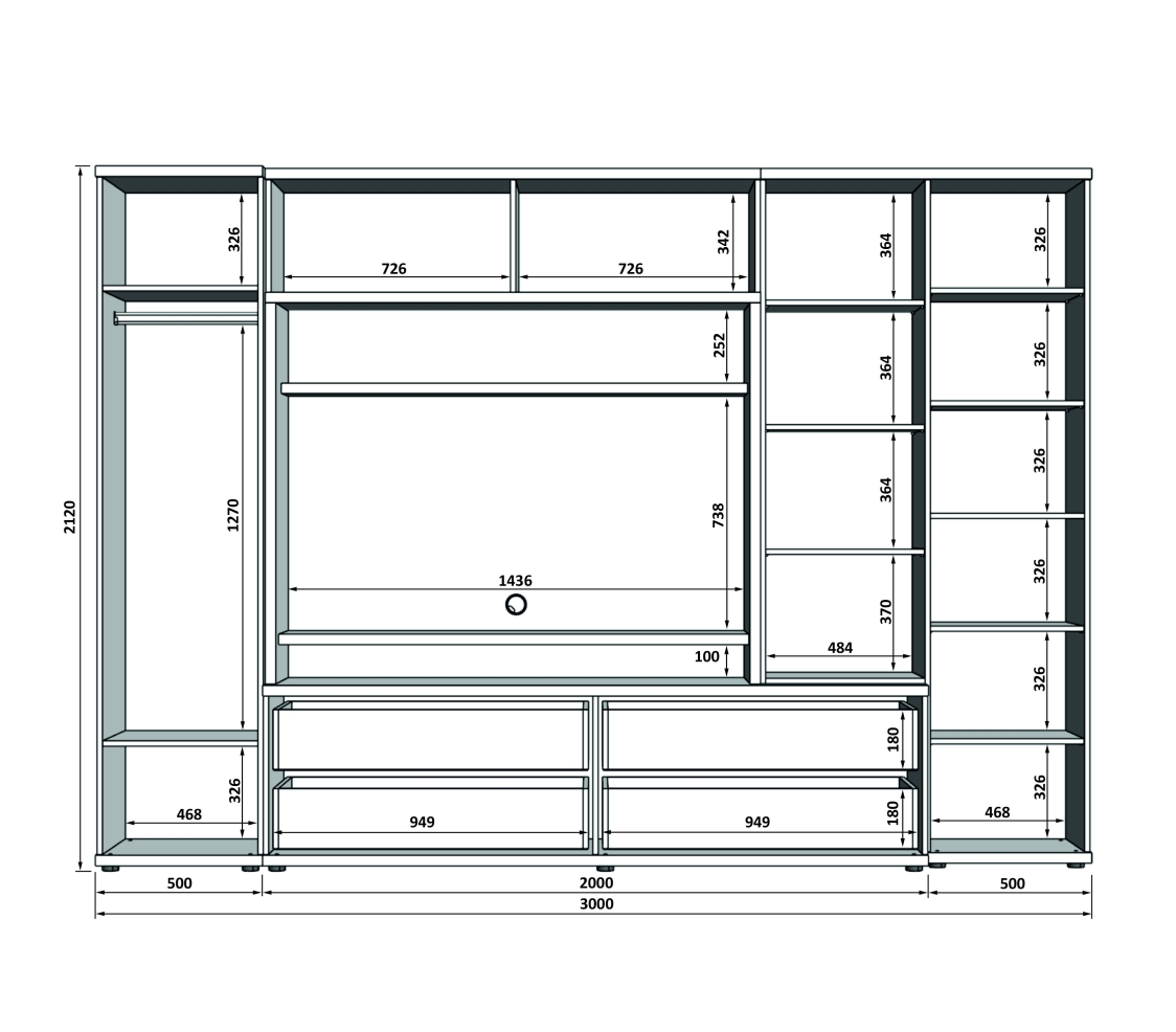 - Нагрузка: на полку — 5 кг, на полку из стекла 4 мм.— 4 кг, на штангу — 15 кг, на дно ящика — 10 кг, на крышку тумбы —10 кг.