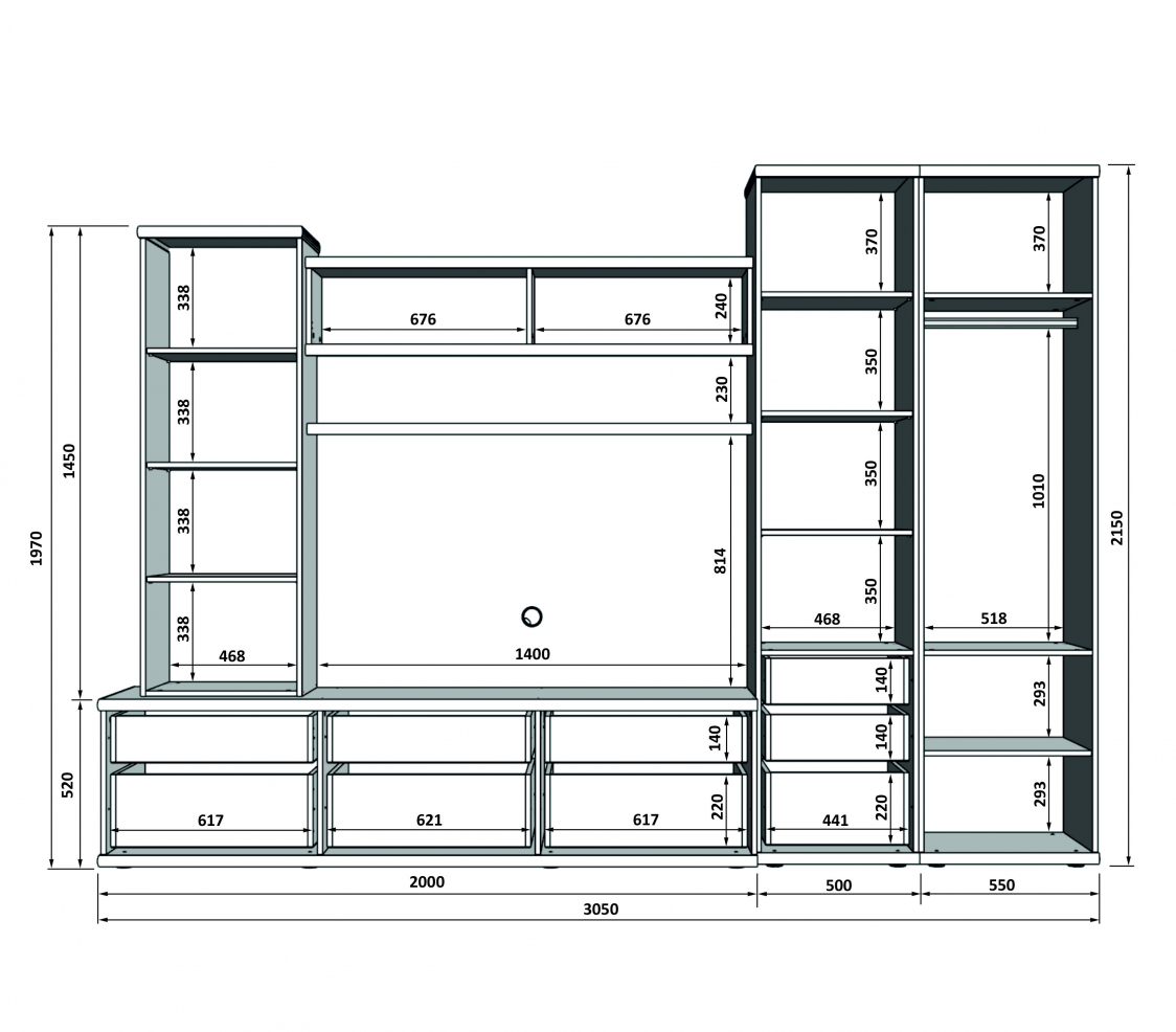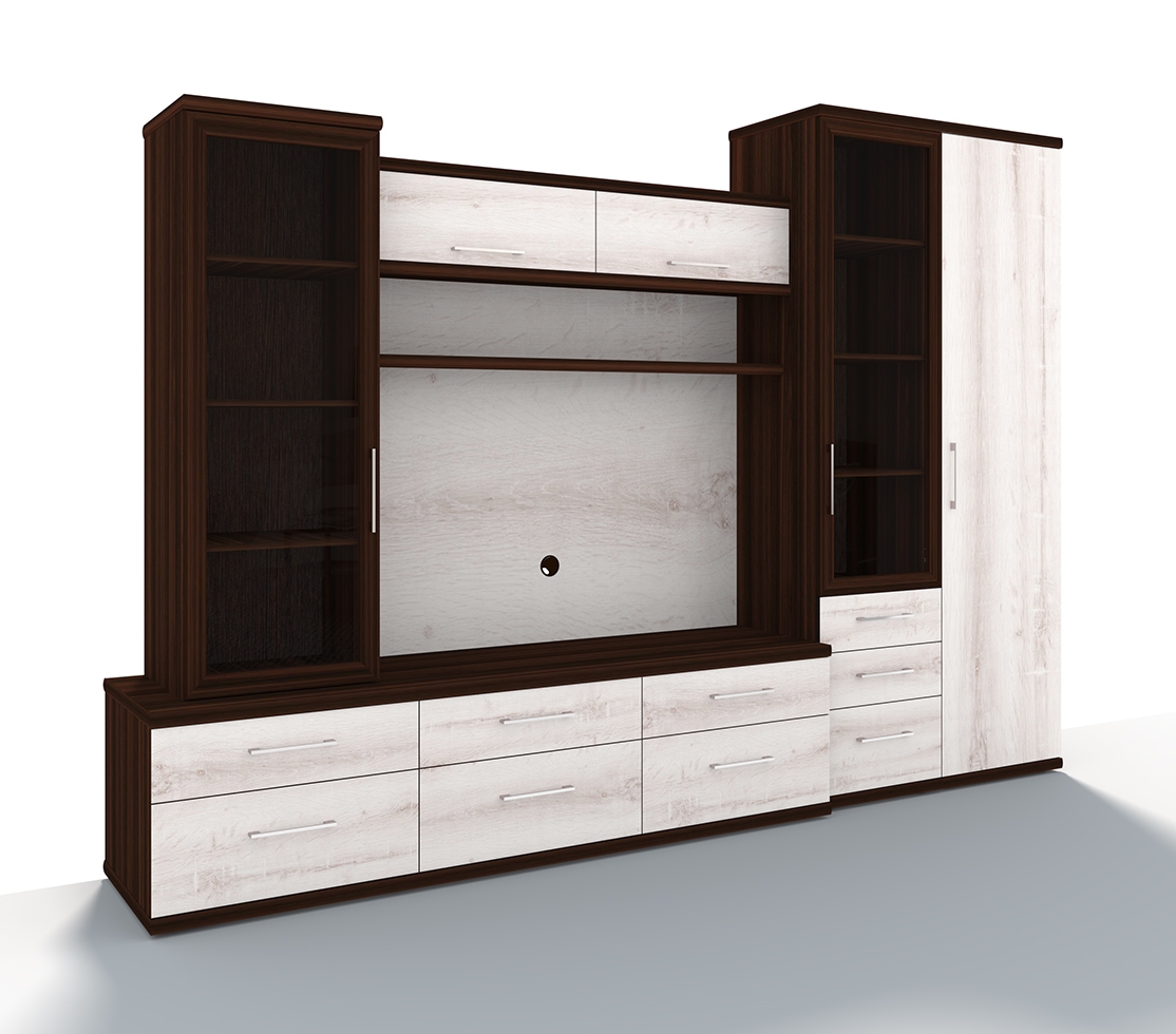 Модульная стенка Бали 2 сделает гостиную уютной и комфортной. Элементы собираются в единую конструкцию, закрытые секции гармонично сочетаются с открытыми. Предусмотрена тумба с задним щитом для установки телевизора. Подходит для хранения посуды, мелкой техники, текстиля. Удачный выбор для обустройства комнаты небольшой площади.