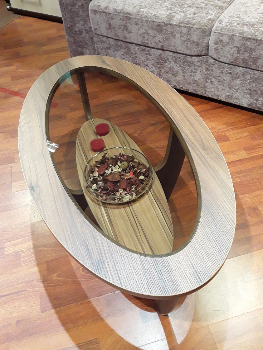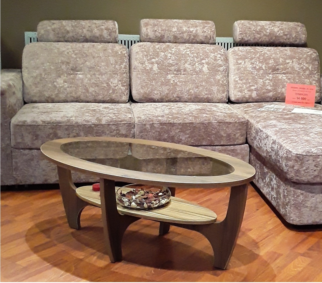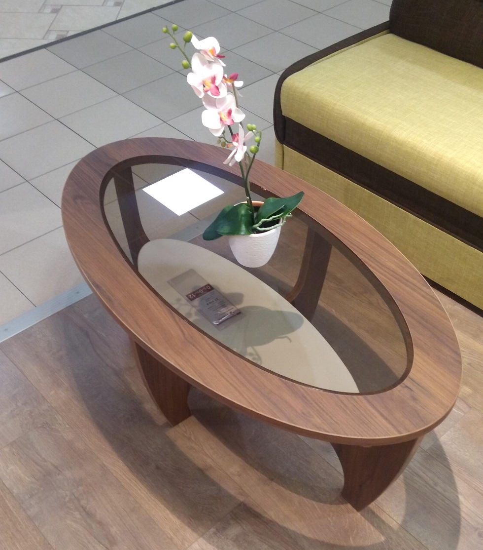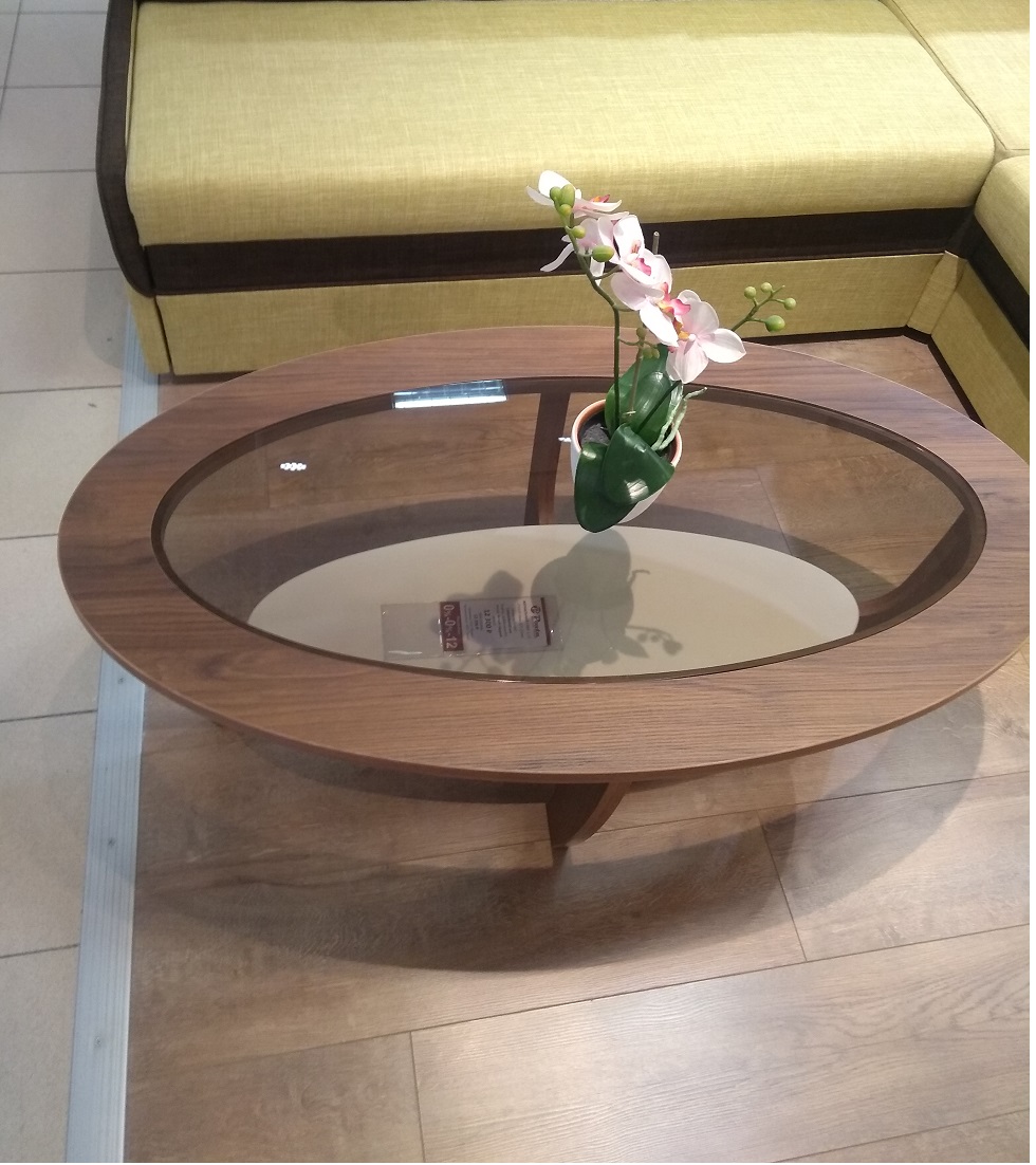 Журнальный овальный стол С-13 со стеклом по центру, с 1 полкой. Столешница и опоры толщиной 22, полка ЛДСП 16 мм, стекло бронза 6 мм.