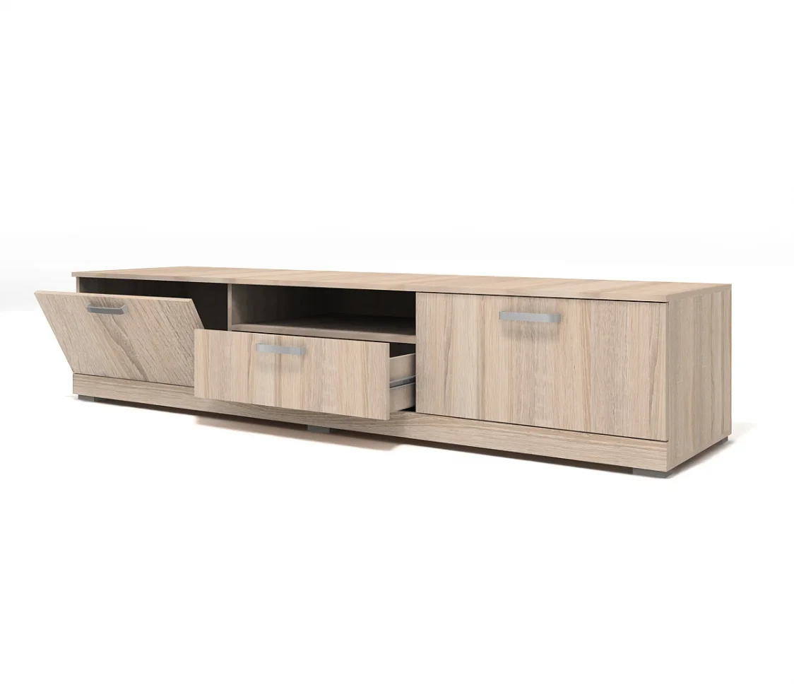Тумба под телевизор М-61 Монако с 3 отделениями + ниша, наполнение 2 откидных фасада ЛДСП (механизм "клок" открывание вниз) и выдвижной ящик.
