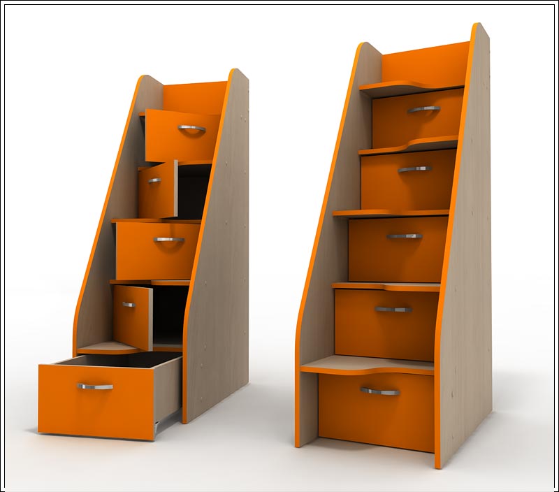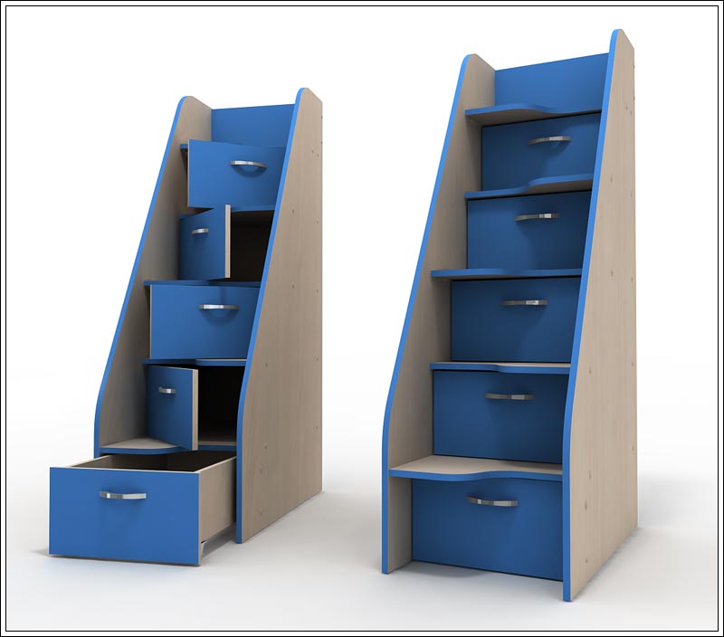 Лестница-комод ДК 6-4 Стриж с 4 открывающимися дверцами (ДК 6-5 с выкатным ящиком), может быть заказана и как дополнение к любой серии Подростковой мебели, и как отдельный предмет интерьера. Дверцы в ящиках открываются поочередно вправо и влево.
