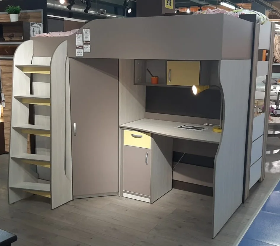 Кровать-чердак Чибис - понравится и школьнику, и подростку. Под основанием спального места предусмотрено место для рабочей зоны – здесь установлен письменный стол с тумбой и навесная открытая полка. Шкаф откатной, в закрытом виде остается незаметным, но в его вместительных секциях можно хранить одежду, обувь, спортивный инвентарь. Лестница представляет собой модифицированный комод. Под ступенями размещены ящики для игрушек, книг, экипировки. Комплектацию модулей и их расстановку можно менять в зависимости от габаритов и планировки подростковой комнаты.