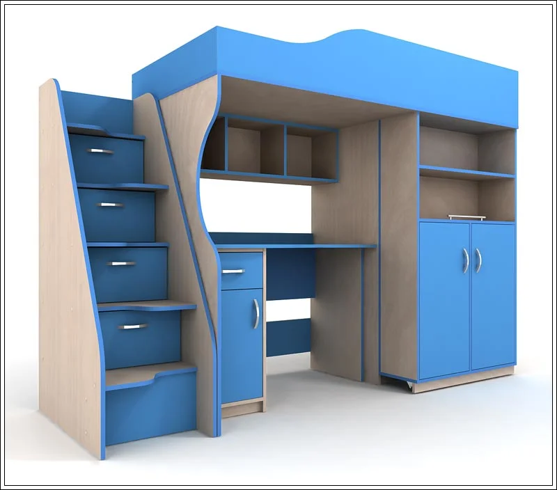 Кровать-чердак Чибис - понравится и школьнику, и подростку. Под основанием спального места предусмотрено место для рабочей зоны – здесь установлен письменный стол с тумбой и навесная открытая полка. Шкаф откатной, в закрытом виде остается незаметным, но в его вместительных секциях можно хранить одежду, обувь, спортивный инвентарь. Лестница представляет собой модифицированный комод. Под ступенями размещены ящики для игрушек, книг, экипировки. Комплектацию модулей и их расстановку можно менять в зависимости от габаритов и планировки подростковой комнаты.