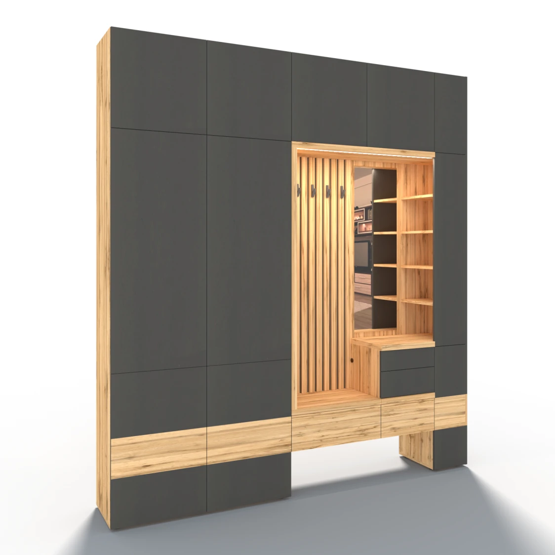 Элегантный в своей простоте комплект мебели для прихожей Лира гармонично впишется в классический и современный интерьер. В набор входят 2 шкафа: 2-створчатый с полками и штангой; 1-створчатый шкаф-консоль, по центру полки, внизу отделение с 1 полкой и дверцей. Тумба-обувница с откидными и выдвижными полками подходит для хранения сезонной обуви. На задней панели между шкафами установлено зеркало. В верхней части расположены антресоли. Мебельный комплект не выглядит шаблонно. Можно подобрать модули и выбрать цвет корпуса и фасадов в соответствии с индивидуальными пожеланиями.
