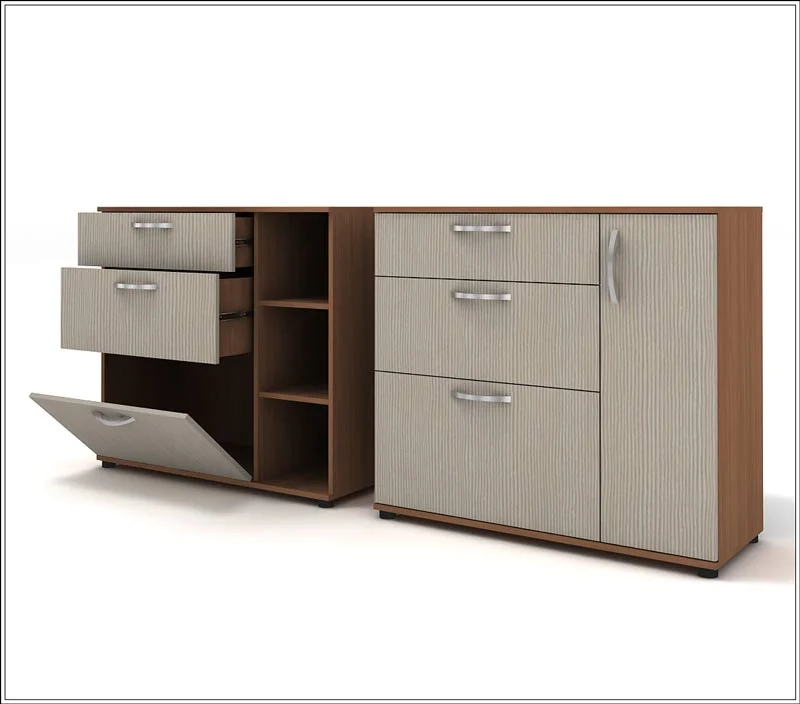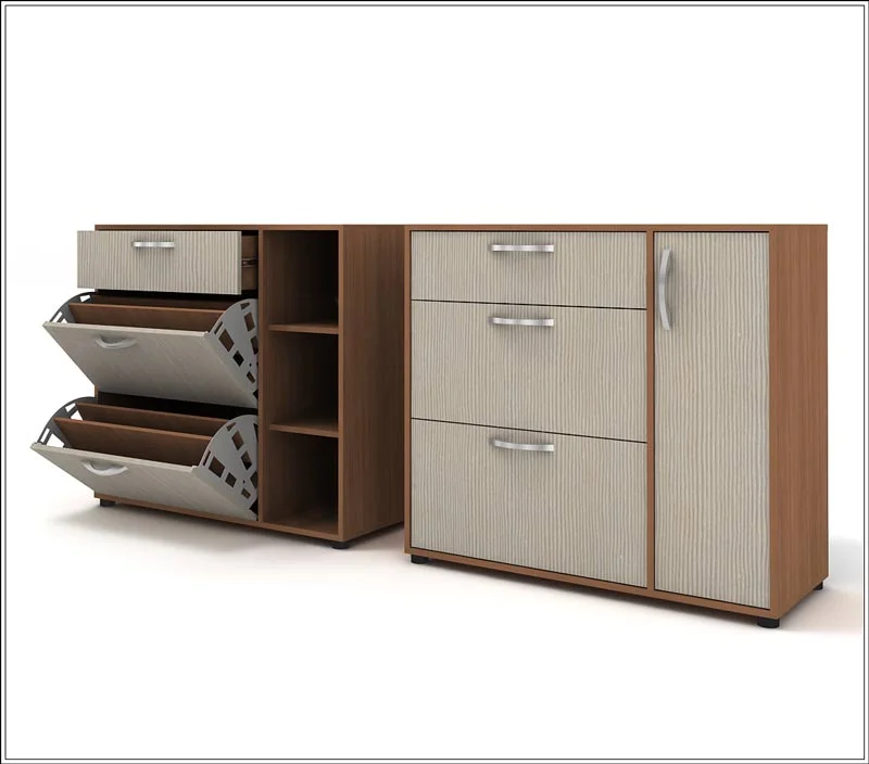 - Ш-22 Комод с 3 ящиками + отделение с 2 полками и фасадом, или обувница Ш-24 с 1 выдвижным и 2 откидными ящиками + отделение с 2 полками и фасадом. В/Ш/Г: 900*1000*400 мм.