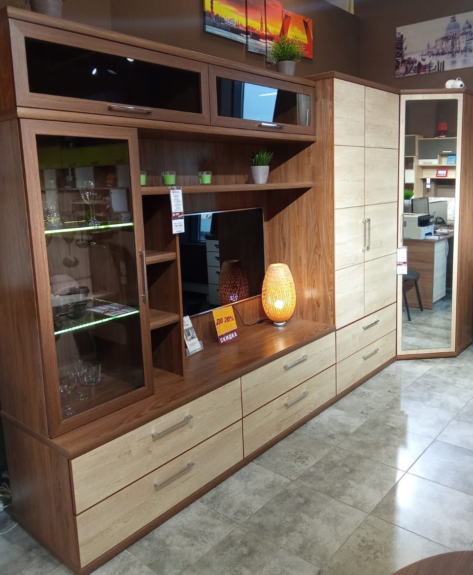 Стенка для гостиной Корсика с зеркалом, в сборе. Цвет корпуса ДСП орех нефис, фасады дуб мадуро, стекло бронза, 2 полки в витрине стекло, с подсветкой, фурнитура Хеттих, в сборе. По желаню в наборе можно приобрести шкафы отдельно!