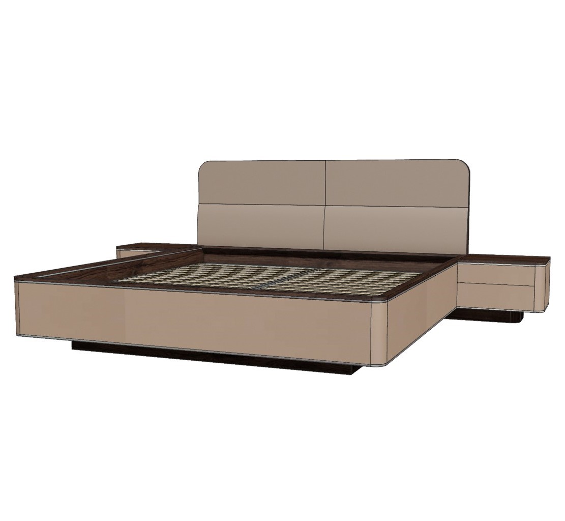 Кровать комплектуется подъёмным механизмом и ортопедическим основанием с ящиком для белья. Тумбы с 2 ящиками, направляющие на ящиках полного выдвижения, скрытые с РТО.