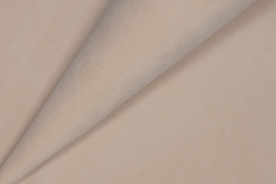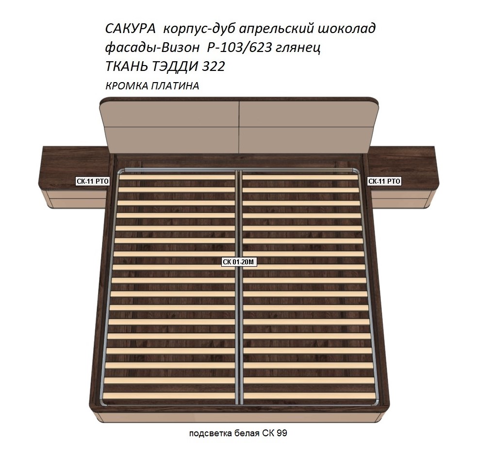 Кровать 2-спальная СК 01-20 Сакура с подсветкой (без матраса) + 2 прикроватные тумбы СК-11 РТО МДФ (направляющие со скрытыми доводчиками), в цвете ДСП Дуб апрельский шоколадный, фасады и боковины МДФ Р103/623 Визон глянец, кромка платина. Изголовье обито велюром Teddy 322 бежевого оттенка. Профиль на углах закруглённой формы.