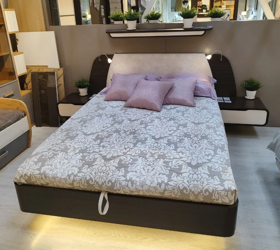 - По обеим сторонам кровати встроены тумбы с выдвижными ящиками, открытие ящика без ручки. Крепятся единой конструкцией к каркасу кровати;