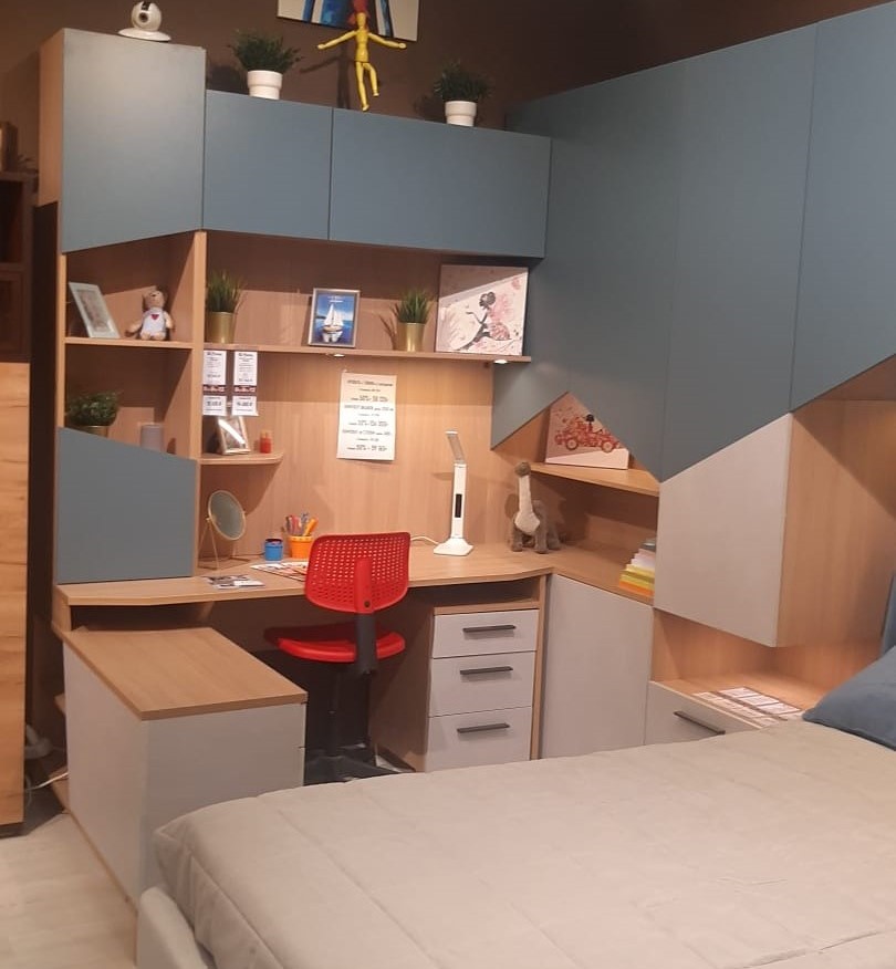 Часть набора мебели для подростков Токио, со столом с тумбами, в расцветке ЛДСП корпуса - Орех Неаполь, фасадов - Пасифай / МДФ Р253 Оксид св.серый, в сборе. Стул в подарок!