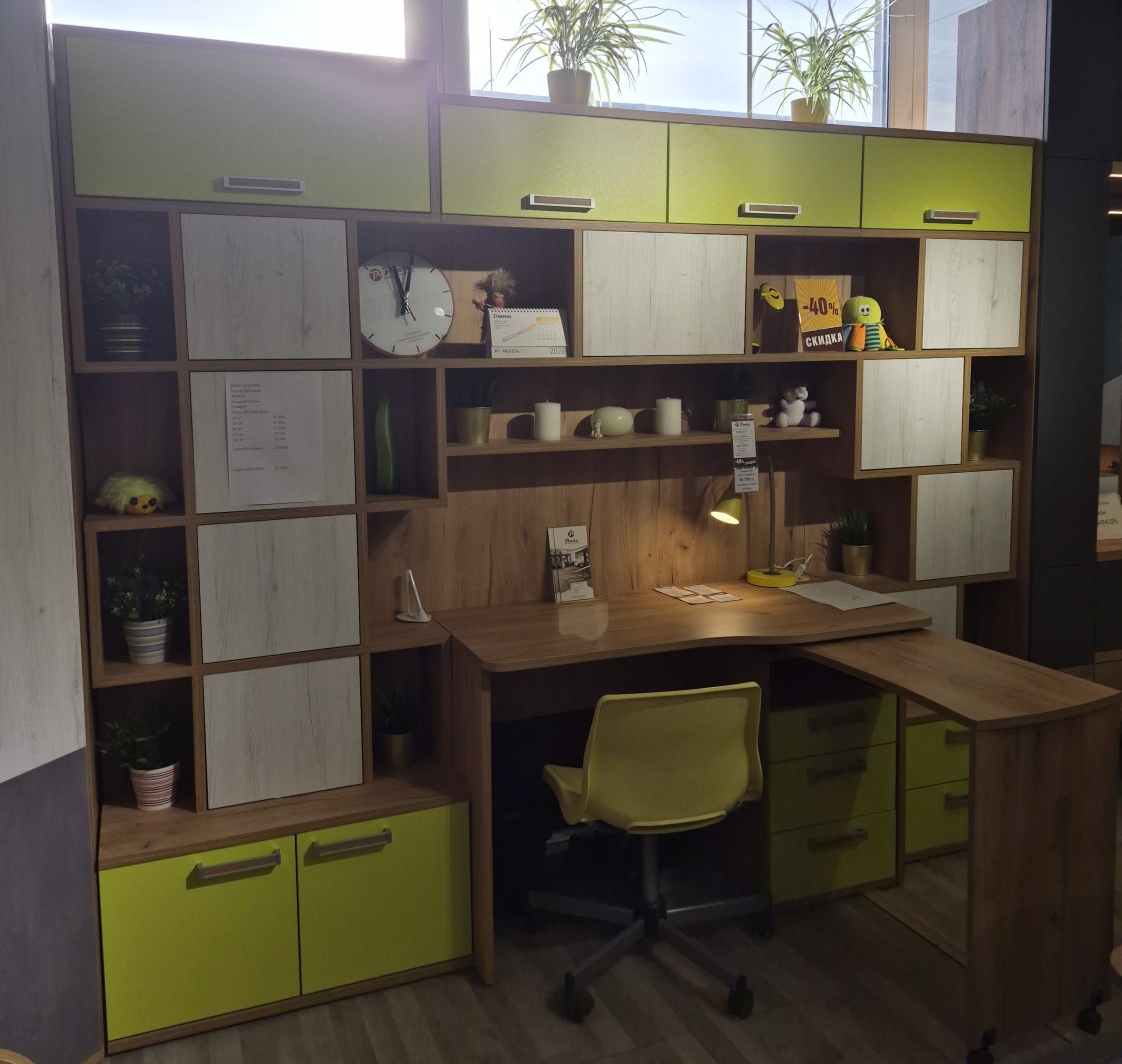 Часть набора мебели ОРИОН-2 из ЛДСП цвета корпуса дуб крафт золотой, фасады комбинированы ДСП лайм ламарти и дуб эльза, со столом. Стул в подарок!