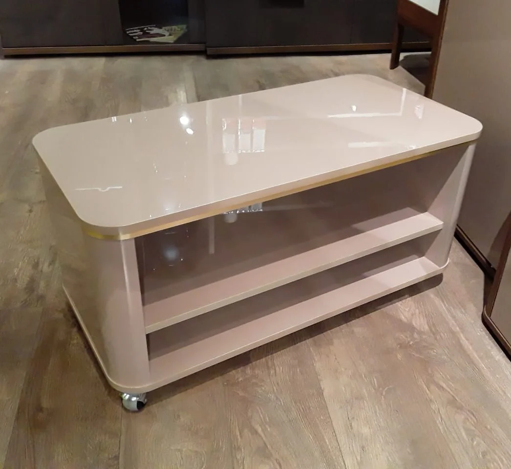 Журнальный стол С-09 на колесах (нестандарт, без ящиков), столешница ЛДСП толщиной 10 мм, полностью из МДФ в цвете Р-103 Визог глянец, гнутые боковины из МДФ, нижняя часть столешницы из ДСП Шимо светлый, кант золото, в сборе.