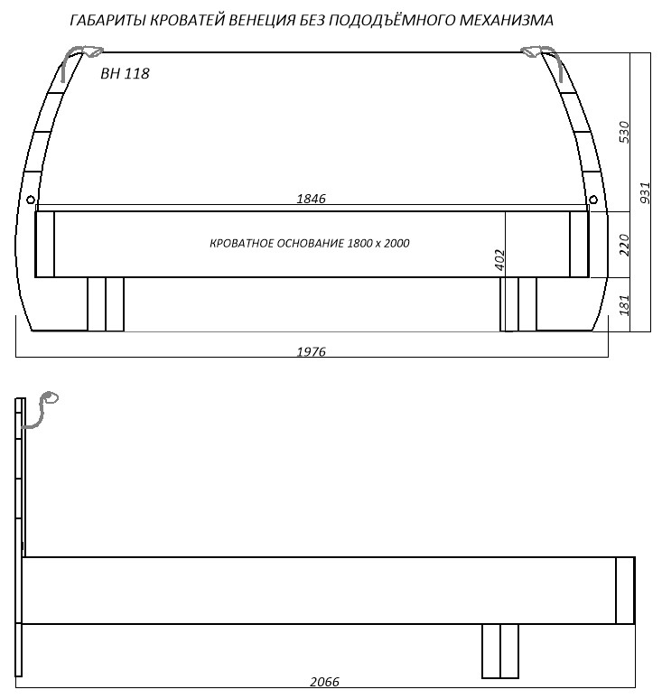 Общие габариты кровати с изголовьем Ш/Г/В: 1976 х 2082 х 926 мм, спальное место 1800х2000 мм.