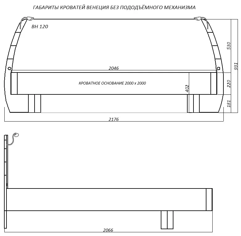 Общие габариты кровати с изголовьем Ш/Г/В: 2176 х 2082 х 926 мм, спальное место 2000х2000 мм.