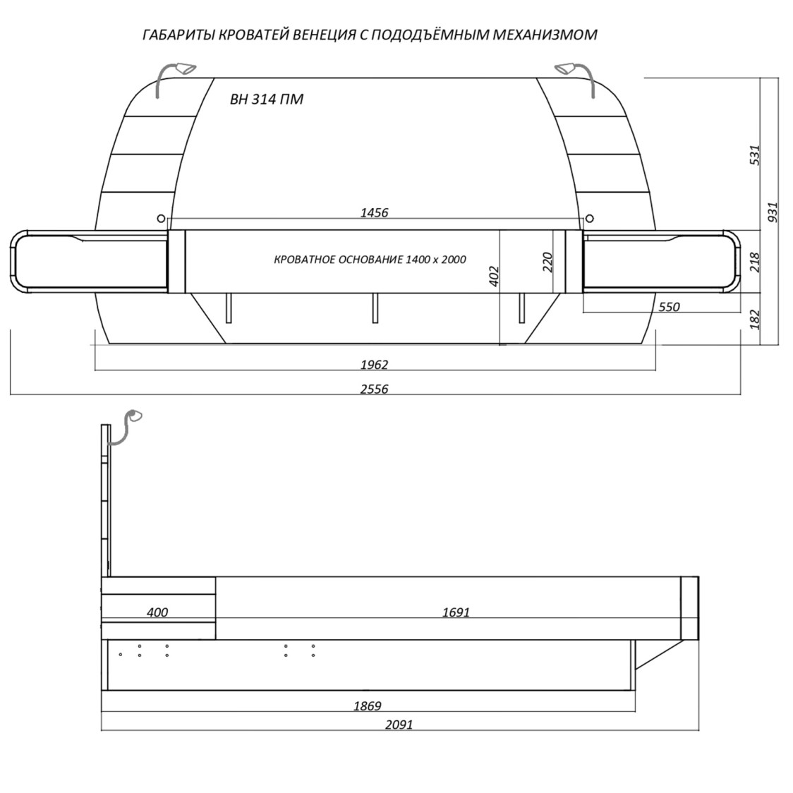 Общие габариты кровати с тумбами Ш/Г/В: 2556 х 2090 х 930 мм, спальное место 1400х2000 мм.