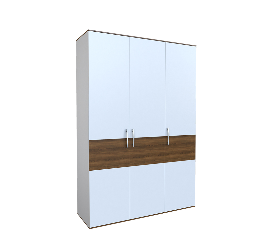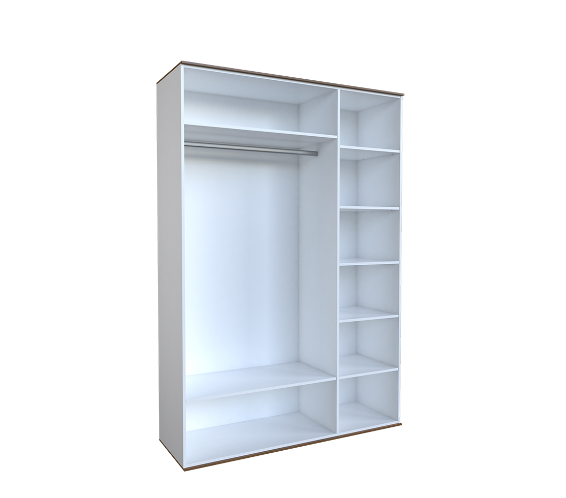 Шкаф 3-створчатый ЭВМ-303с "Эвия" со штангой и 7 полками, фасад ЛДСП составной из 3 частей. Крышка и дно шкафа изготовлены из ЛДСП толщиной 16 мм и обрамлены декоративными планками ЛДСП толщиной 10 мм.